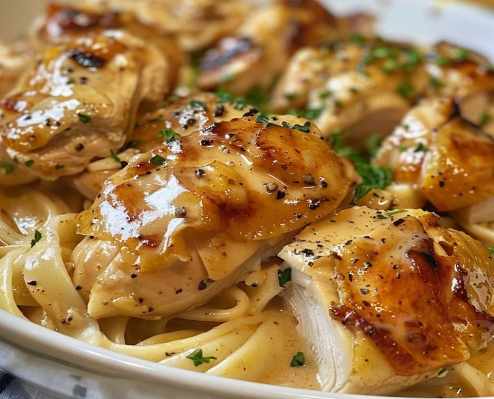 8. Serve the angel chicken over cooked pasta or rice, garnished with chopped parsley.