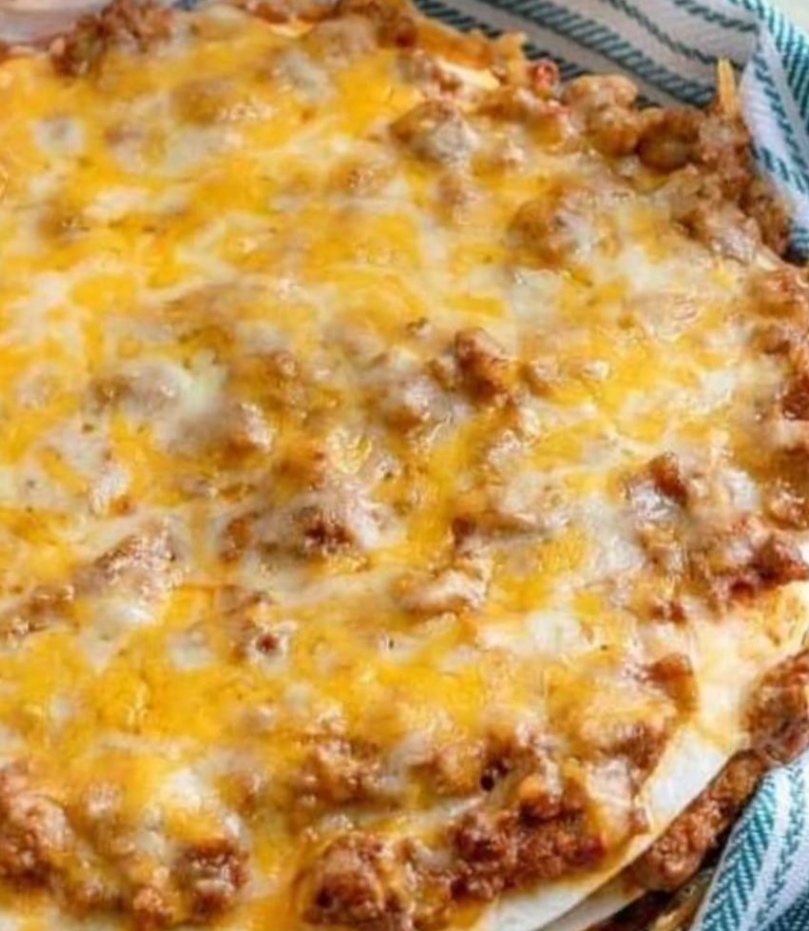Place one tortilla in the bottom of an 8×8 inch baking dish. Spread 1/3 of the beef mixture on top of the tortilla. Sprinkle 1/3 of the cheese on top of the beef mixture.