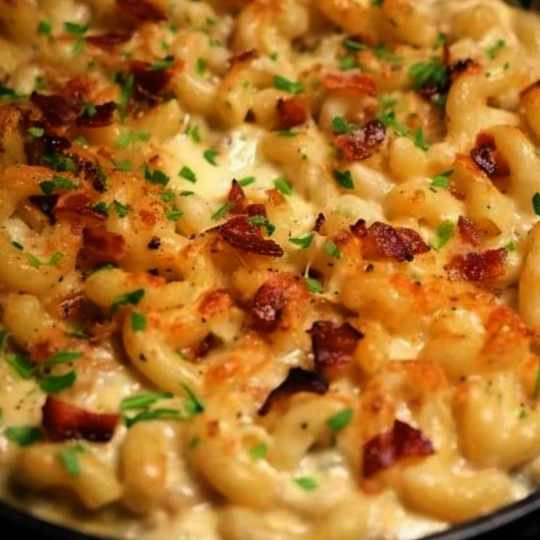 5. Combine cooked macaroni, caramelized onions, and cheese sauce in the skillet. Mix well and add most of the bacon, saving some for topping.