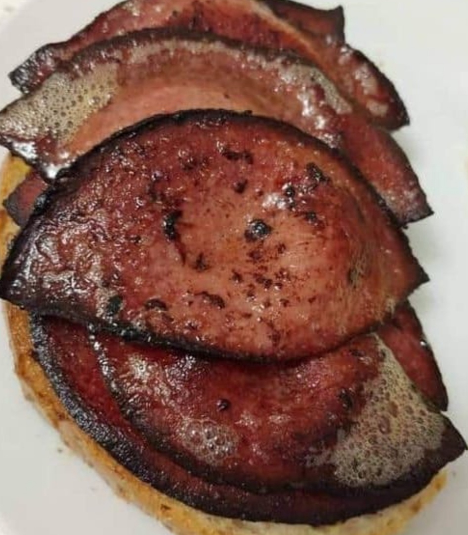 7.Remove the cooked bologna and place three slices on each sandwich.