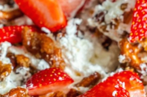 - For Serving: When ready to serve, gently fold the 4 cups of sliced strawberries and the cooled pretzel crunch into the cream cheese mixture. Mix these in just before serving to maintain the crunchiness of the pretzel layer. If desired, you can reserve some extra pretzel crunch to sprinkle on top of individual servings for added texture and visual appeal.