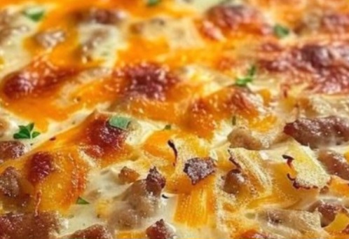 - Add Cheese and Sausage: Sprinkle the shredded Gouda cheese evenly over the hashbrowns. Then, layer the cooked sausage over the cheese, distributing it evenly across the dish.