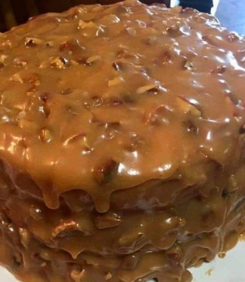 Three layers of fluffy white cake baked with candied pecans, then soaked in pecan flavored syrup, topped with spiked cream cheese frosting.