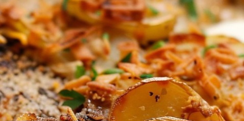 - Layer the potato slices in an even layer in a 9×13 baking dish. Top with the seared pork chops.
