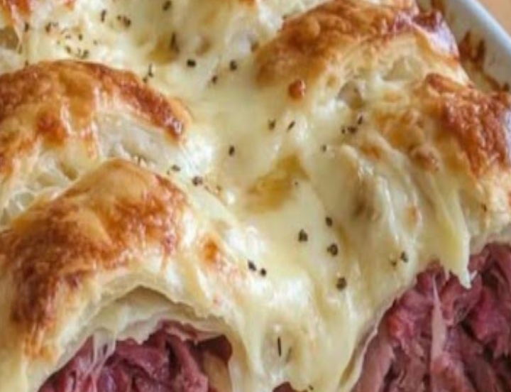 Reuben Crescent Bake – A Comfort Food Twist You’ll Fall in Love WithFew dishes capture the cozy warmth of classic American comfort food quite like the Reuben Crescent Bake. Imagine everything you love about the famous Reuben sandwich — the tangy sauerkraut, the melty Swiss cheese, the savory corned beef, and the creamy Thousand Island dressing — all layered between flaky, buttery crescent roll dough and baked until perfectly golden and bubbling. It’s the ultimate crowd-pleasing meal that turns an ordinary dinner into something truly irresistible.This recipe is not just about convenience; it’s about flavor harmony. The buttery crescent crust provides a tender, golden foundation, while the layers of corned beef and cheese deliver hearty richness. The sauerkraut adds just the right touch of tang, and the creamy dressing ties it all together with that signature Reuben zest. Whether you’re cooking for a busy weeknight, a weekend family dinner, or a game-day crowd, this Reuben Crescent Bake will have everyone reaching for seconds.Why You’ll Love This Reuben Crescent BakeThis baked Reuben casserole combines the comfort of homemade cooking with the ease of a quick-prep meal. Here’s why it’s become a favorite across kitchens nationwide:Quick and easy: With simple ingredients and crescent roll dough, it comes together in minutes.Perfectly balanced flavors: The tanginess of sauerkraut and dressing complements the savory corned beef beautifully.Ideal for gatherings: It’s easy to slice and serve, making it perfect for potlucks, holidays, or casual dinners.Comfort in every bite: The flaky, buttery crust and gooey, melty cheese create a truly satisfying experience.Ingredients and Their RolesEach ingredient in this Reuben Crescent Bake recipe plays a specific part in building its layers of flavor and texture. Let’s break down what you’ll need and why it matters:1. Crescent Roll Dough (2 cans, 8 ounces each)This is the foundation of your bake — it serves as both the crust and the topping. The crescent dough becomes flaky and buttery once baked, creating a perfect contrast to the creamy, savory filling inside. Using refrigerated crescent rolls makes preparation quick without sacrificing flavor or texture.2. Corned Beef (1 pound, thinly sliced)The star of the show! Corned beef provides that classic Reuben flavor — salty, tender, and deeply savory. You can use deli-sliced corned beef or leftover homemade corned beef. Either way, it delivers rich umami that defines the dish.3. Swiss Cheese (8 slices or 2 cups shredded)Swiss cheese is known for its mild nuttiness and excellent melting quality. It complements the corned beef beautifully, adding creamy depth to each bite. The gooey texture when melted creates that signature Reuben sandwich experience in baked form.4. Sauerkraut (1 cup, drained and patted dry)Don’t skip this ingredient! Sauerkraut adds acidity and tang, balancing the richness of the cheese and beef. Be sure to drain it well — too much liquid can make the bake soggy.5. Thousand Island Dressing (1/2 cup)This creamy, slightly sweet dressing ties everything together. It adds moisture, zest, and a touch of sweetness that cuts through the salty corned beef. You can substitute with Russian dressing for a sharper, more peppery flavor.6. Caraway Seeds (optional, 1 teaspoon)If you love traditional Reuben flavor, sprinkle caraway seeds on top before baking. They mimic the taste of rye bread, staying true to the sandwich’s roots while adding aromatic crunch.7. Egg Wash (1 egg beaten with 1 tablespoon water, optional)Brushing the top crescent layer with an egg wash gives your bake a glossy, golden finish and helps lock in moisture.Step-by-Step Instructions: How to Make Reuben Crescent BakeFollow these easy steps to create a mouthwatering Reuben Crescent Bake that looks and tastes like it came straight from a gourmet kitchen.Step 1: Preheat and PreparePreheat your oven to 375°F (190°C). Lightly grease a 9×13-inch baking dish or line it with parchment paper for easy cleanup.Step 2: Create the Bottom CrustUnroll one can of crescent dough and press it evenly into the bottom of your baking dish. Pinch the seams together to form a solid crust base. Bake for 7–8 minutes until lightly golden — this prevents the bottom from getting soggy once the filling is added.Step 3: Layer the IngredientsRemove the dish from the oven and start layering your ingredients:Spread a thin layer of Thousand Island dressing over the partially baked crust.Add half of the Swiss cheese slices in an even layer.Top with all of the corned beef, evenly distributed.Spoon the sauerkraut evenly over the beef layer.Add the remaining cheese slices to seal in the moisture.Step 4: Top and SealUnroll the second can of crescent dough and place it carefully over the top. Pinch edges to seal and tuck them slightly along the sides of the pan. Brush with egg wash if desired for a shiny golden crust. Sprinkle with caraway seeds for that authentic Reuben touch.Step 5: Bake to PerfectionBake uncovered for 20–25 minutes, or until the top is deeply golden brown and crisp. The cheese should be melted and bubbling around the edges.Step 6: Rest and ServeLet the bake rest for about 10 minutes before slicing. This allows the layers to set and makes it easier to cut neat squares. Serve warm and enjoy every bite of that melty, flaky, tangy-sweet perfection.Pro Tips for the Perfect Reuben Crescent BakeDrain your sauerkraut well: Press it between paper towels to remove excess moisture and prevent sogginess.Use quality corned beef: Choose deli-sliced or homemade corned beef for the best flavor. Avoid canned versions for this recipe.Let it rest before serving: Cutting too soon can cause the layers to slide apart; resting ensures a cleaner slice.Add extra flavor: Mix a tablespoon of Dijon mustard into the dressing for a tangy kick.Try a twist: Substitute rye crescent dough (if available) or sprinkle the top with rye breadcrumbs f