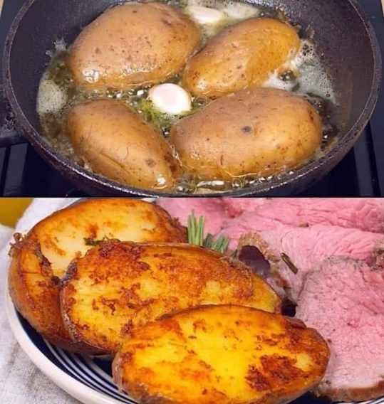 Present the luxury fondant potatoes beside the nicely prepared roast meat pieces.