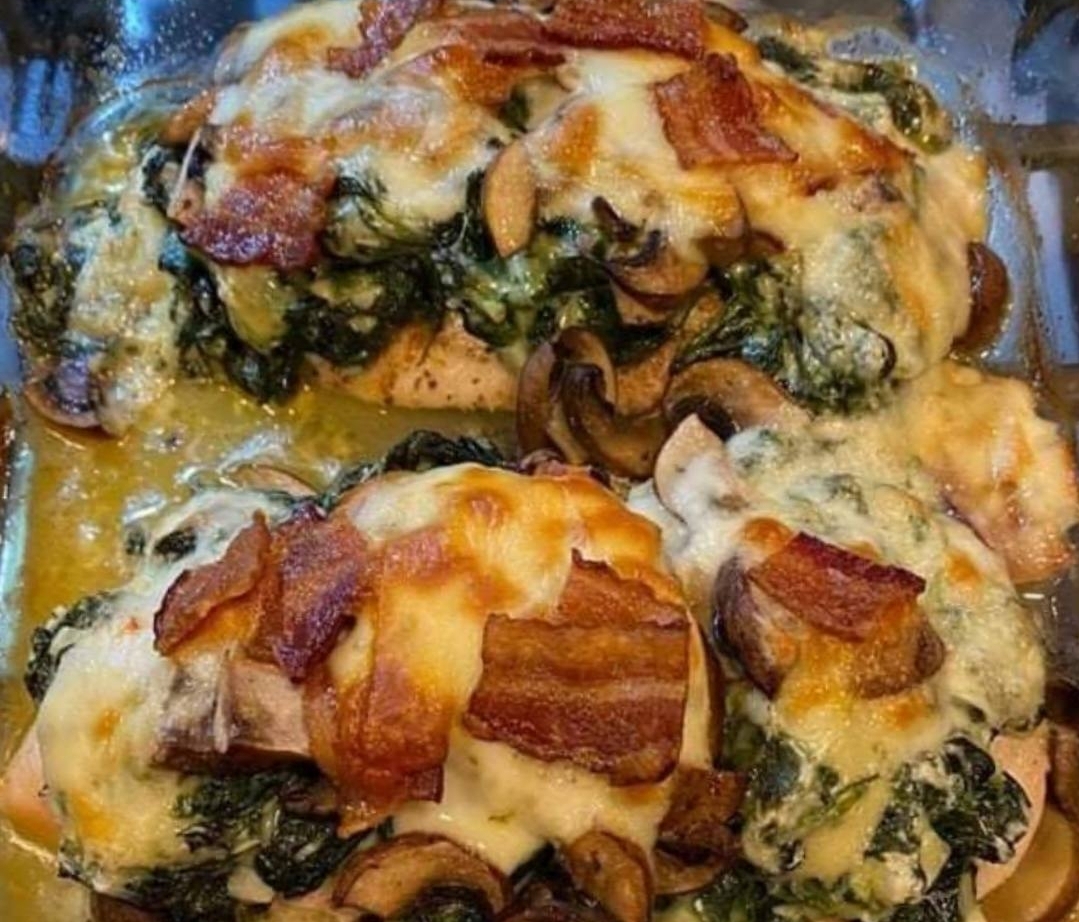 Eliminate the chicken bosoms from the broiler (you prepared them for 15-20 minutes). Top every chicken bosom with the creamed spinach, slashed cooked bacon, cooked mushrooms and broken cuts of pepper jack cheddar. Prepare in the broiler, uncovered for 15-20 additional minutes, until chicken is cooked through, presently not pink in the middle, and the juices run clear. Sear for the last 2-4 minutes, assuming that ideal, being mindful so as not to consume the cheddar on top.