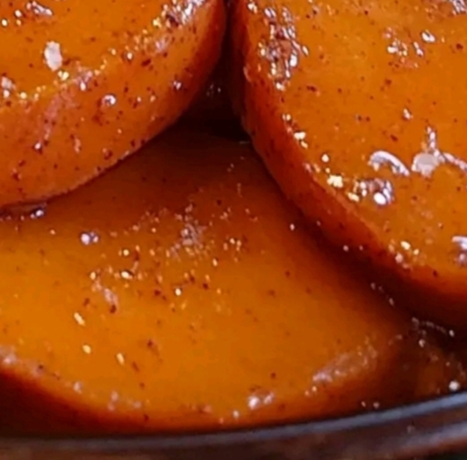 Ingredients4 large sweet potatoes, peeled and sliced into ½-inch rounds½ cup unsalted butter1 cup granulated sugar½ cup brown sugar, packed¼ cup water1 teaspoon vanilla extract (optional)½ teaspoon cinnamon (optional)Pinch of saltInstructionsPrepare the Sweet PotatoesPeel and slice the sweet potatoes into ½-inch thick rounds. Rinse under cold water and pat dry with a paper towel.Make the SyrupIn a large skillet or saucepan, melt the butter over medium heat. Add the granulated sugar, brown sugar, water, vanilla, cinnamon, and salt. Stir well until the sugars dissolve and the syrup begins to bubble gently.Add the Sweet PotatoesCarefully place the sweet potatoes into the pan, coating each piece with the syrup. Lower the heat, cover, and simmer for 45–60 minutes, stirring occasionally. Spoon the syrup over the potatoes as they cook to keep them evenly glazed.Thicken the GlazeRemove the lid during the last 10–15 minutes to let the syrup reduce and thicken into a rich, sticky glaze.ServeServe warm straight from the pan. The potatoes should be soft, buttery, and coated in a caramel-like sauce that’s sweet and flavorful.TipsAdd a pinch of nutmeg for extra warmth.Delicious served alongside roasted turkey, baked ham, or fried chicken.Store leftovers in the fridge for up to 3 days and reheat gently before serving.