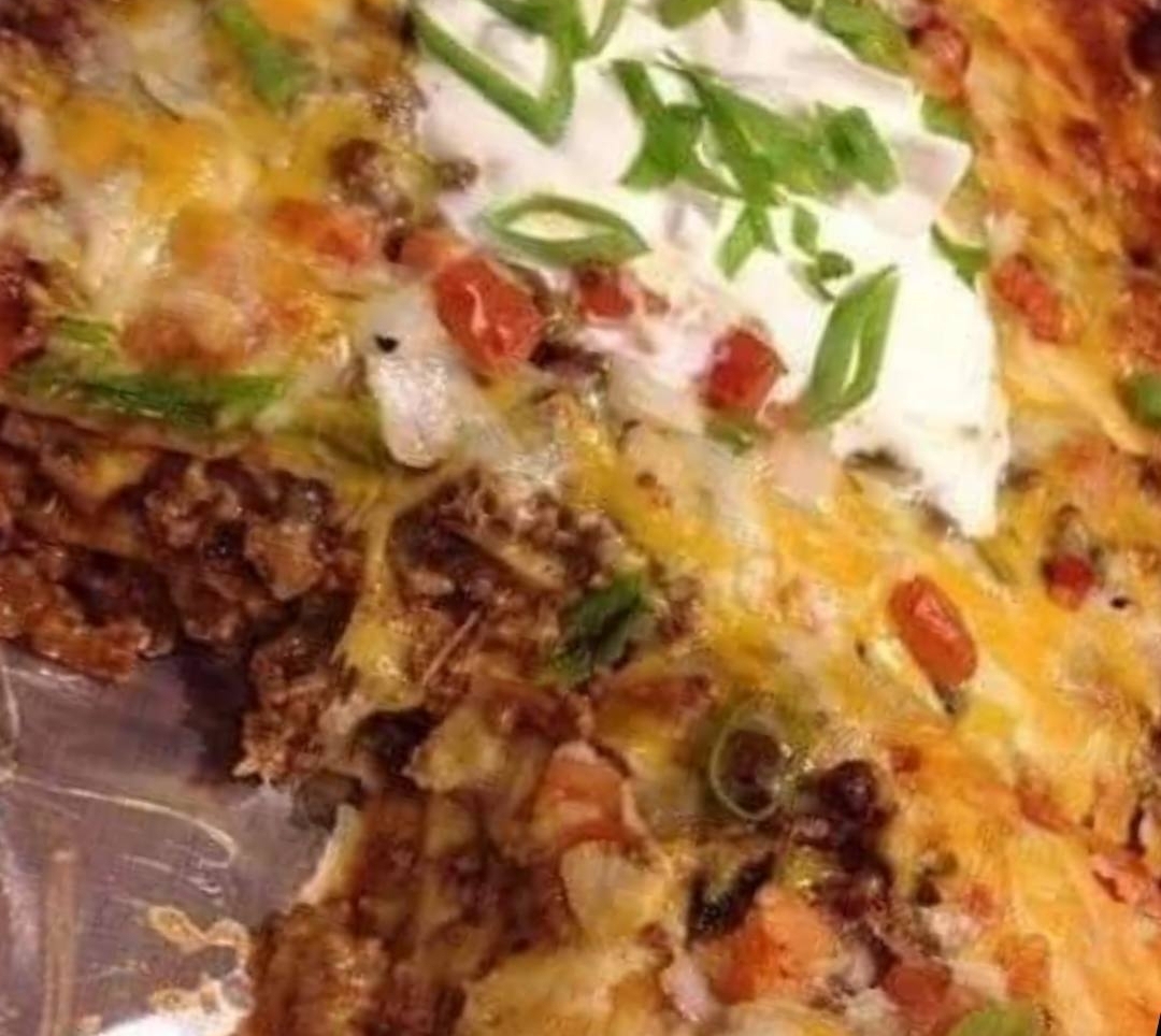 In a 9″ x 13″ pan, repeat the layers as follows: Fritos chips, meat mixture and grated cheese.