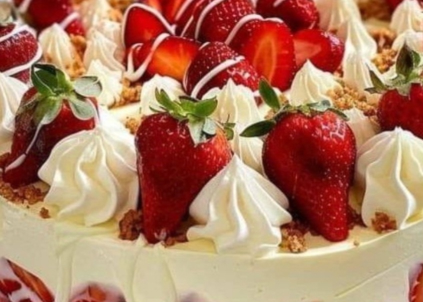 Gently fold in the strawberries.• Pour the mixture you prepared onto the cake and spread evenly.